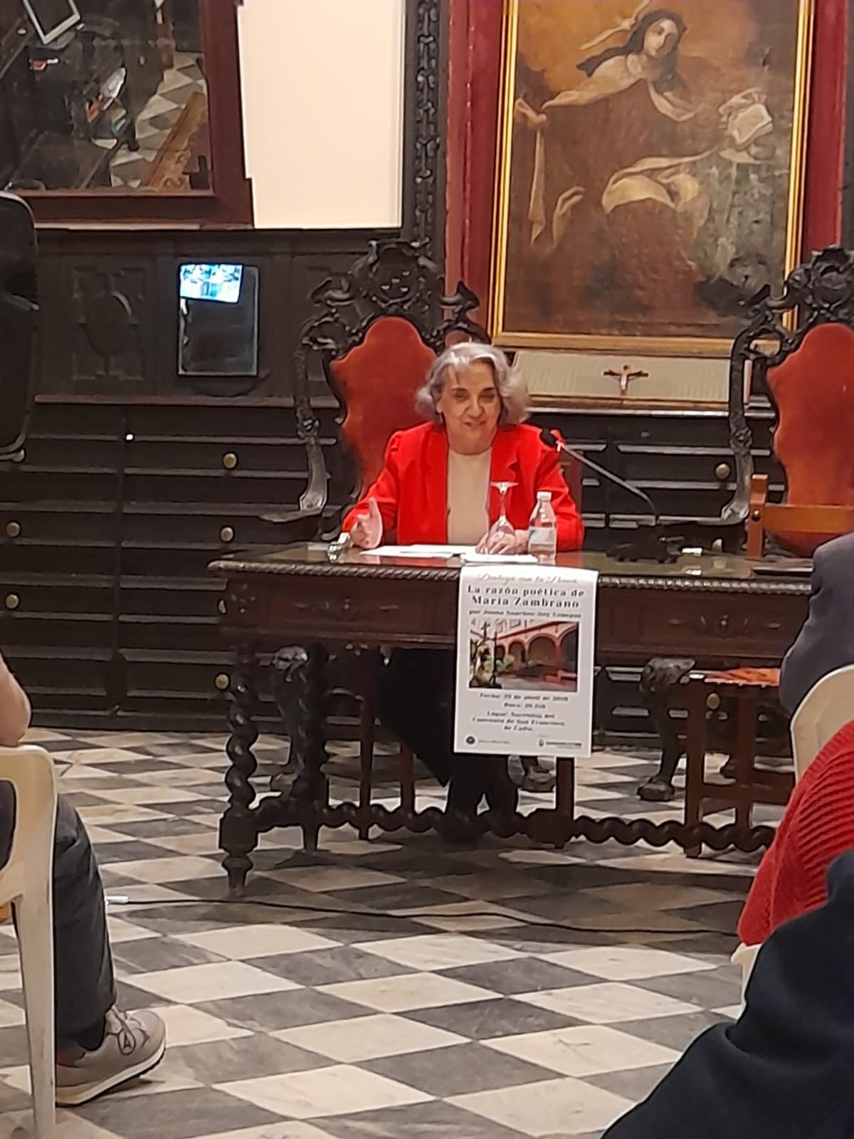 Durante la intervención, la ponente profundizó en una de las aportaciones más originales de María Zambrano: la razón poética, entendida como una vía de conocimiento que integra pensamiento, intuición, experiencia interior y apertura a la verdad. En el coloquio posterior, los participantes ampliaron el diálogo con preguntas sobre la relación de Zambrano con otras grandes figuras del pensamiento europeo, entre ellas Edith Stein.
